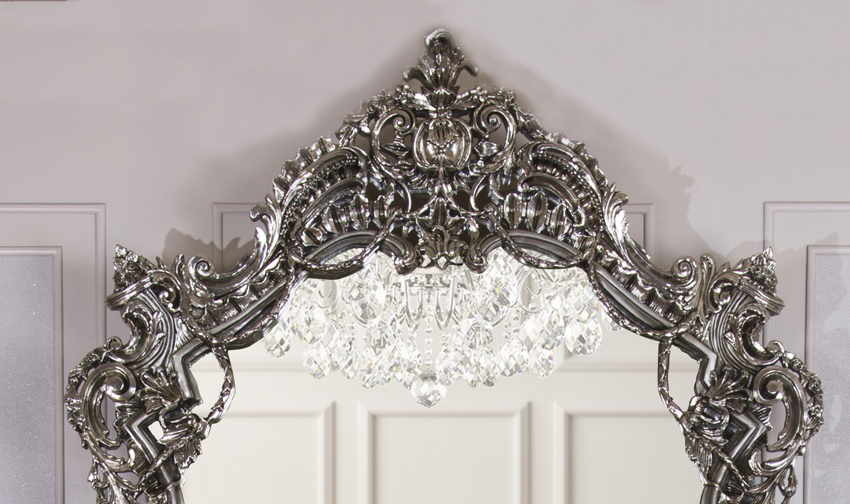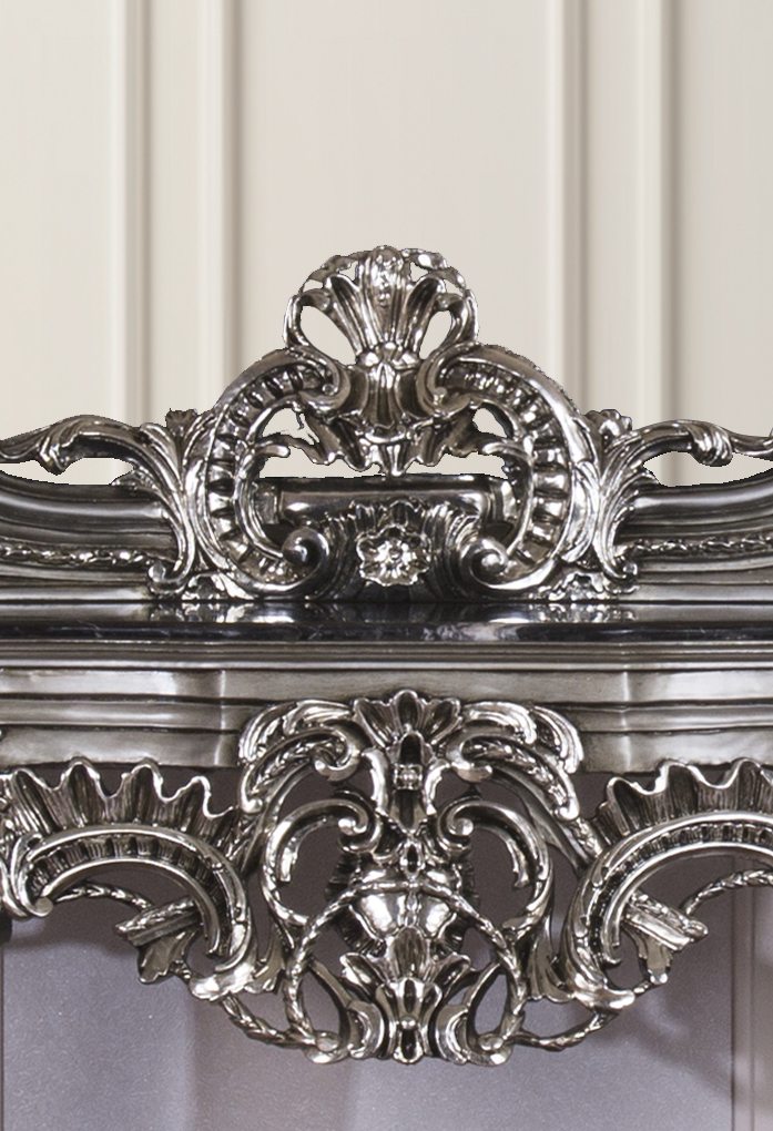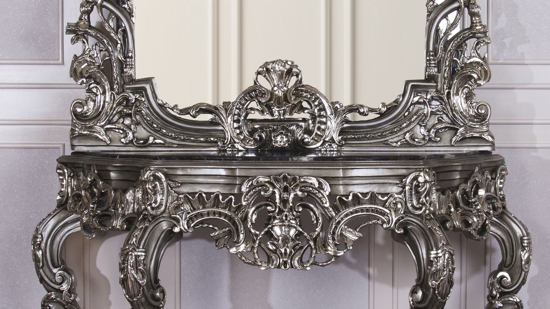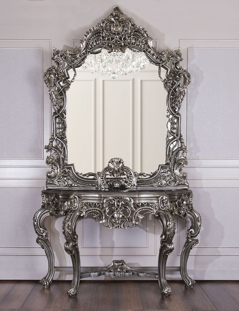 BASTET is a Rocco style full console which is hand carved and crafted out of solid wood in silver and black to give elegance and uniqueness to your interior. This hand crafted and carved console is strikingly stunning and a beautiful centre piece for any entrance or hall way.