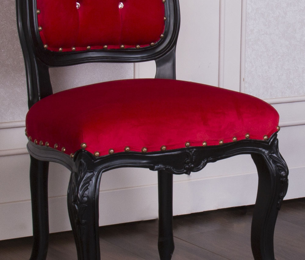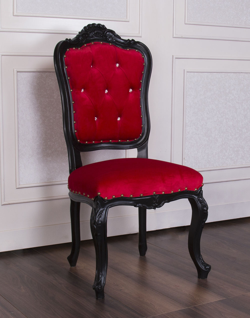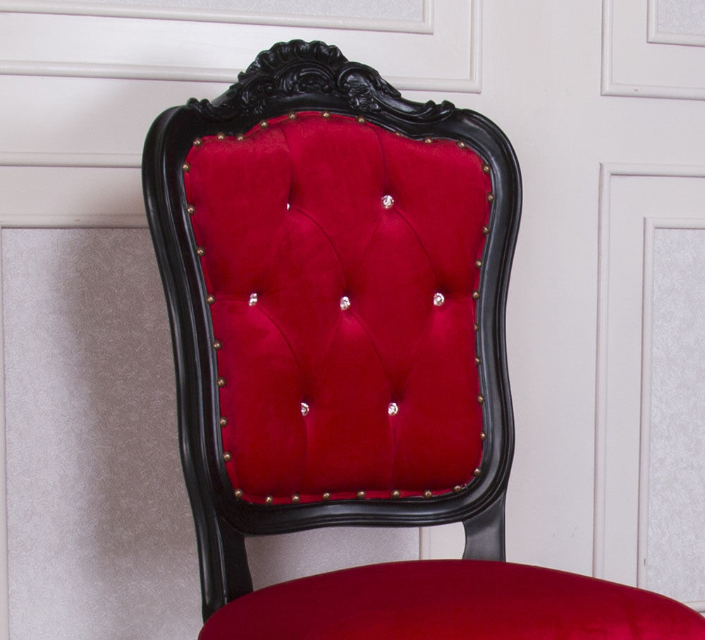 Baroque Style Dining Chair with a Black wooden Frame and Red Faux Suede combined with SW crystals to enhance the Elegance.