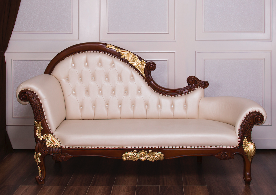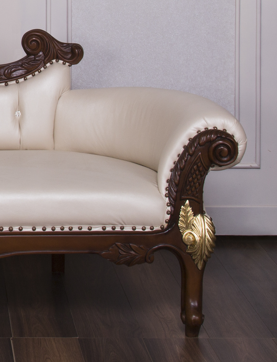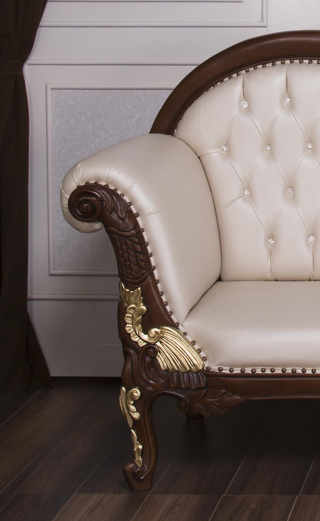 Baroque Style Chaise Lounge with a Dark wooden Frame with Gold details and Champagne Faux leather combined with SW crystals to enhance the Elegance.
