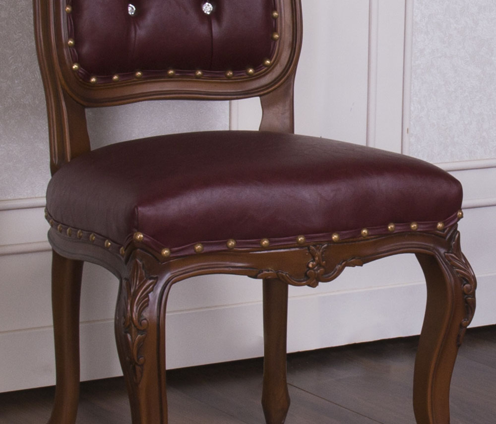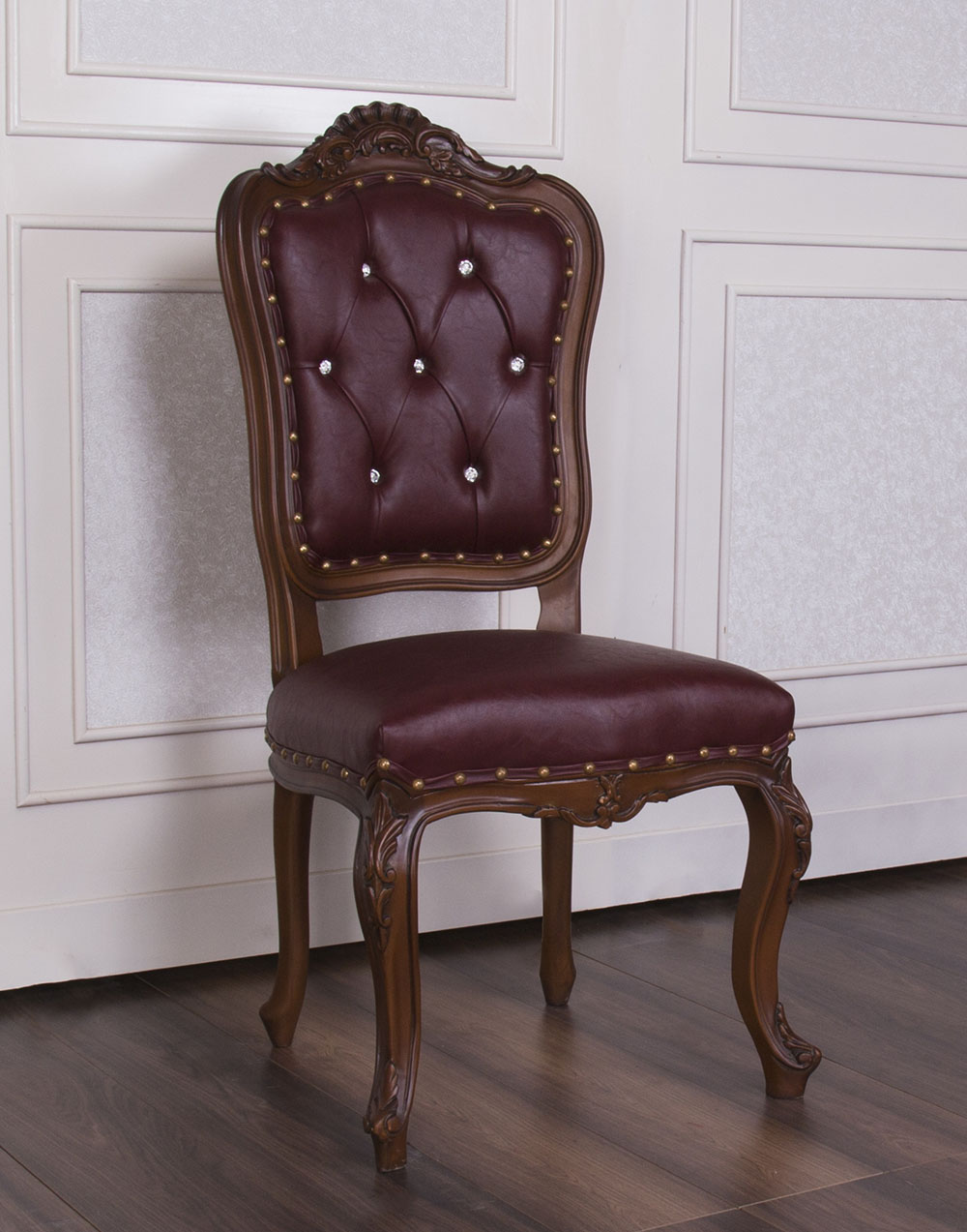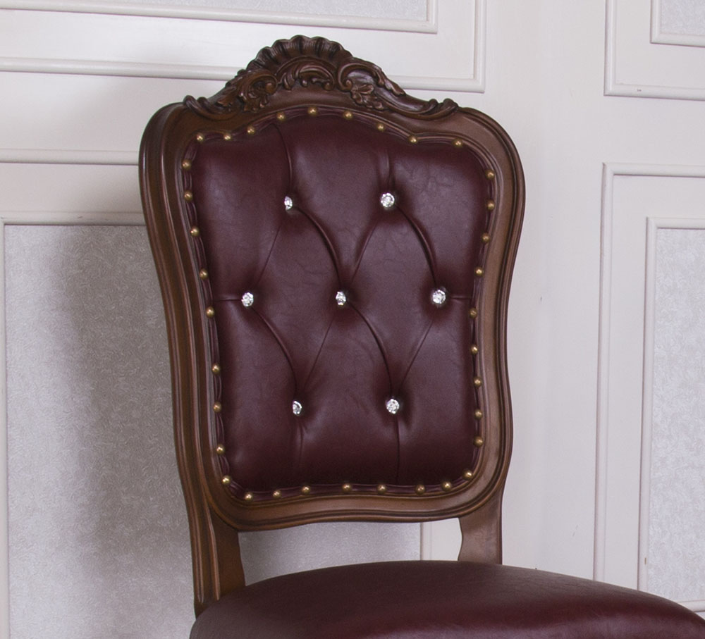 Baroque Style Dining Chair with a Dark Wood wooden Frame and Burgundy Faux Leather combined with SW crystals to enhance the Elegance.