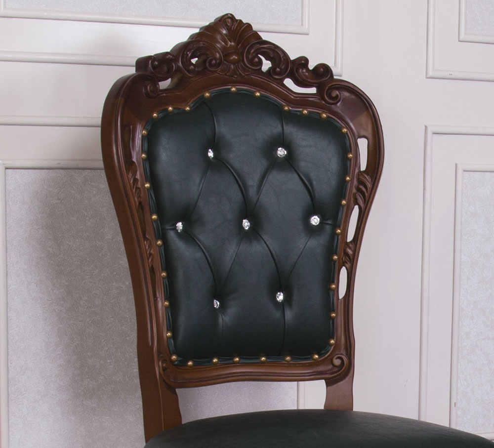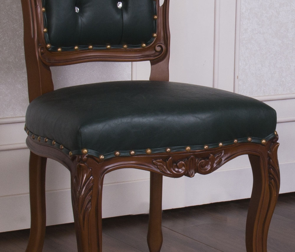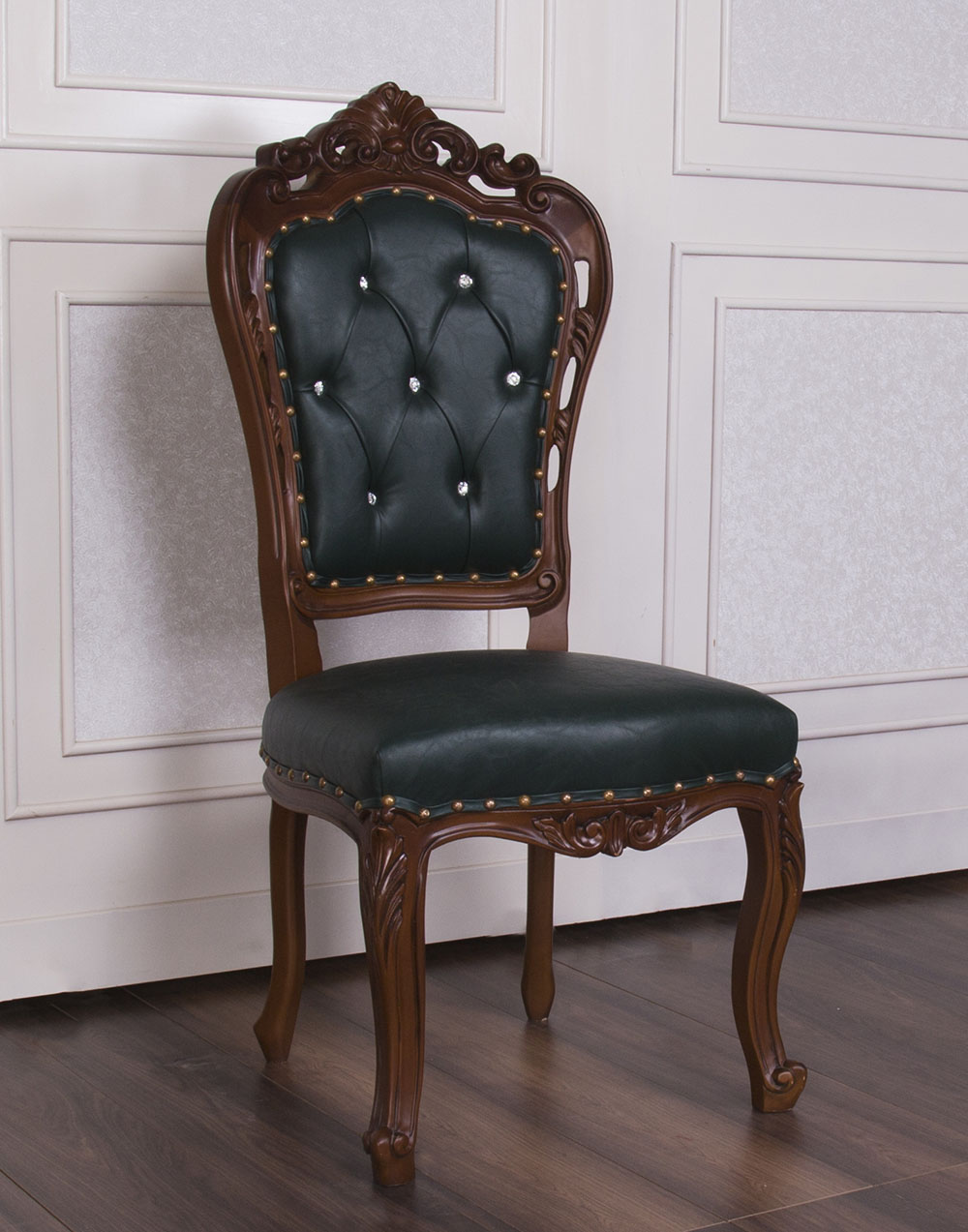 Baroque Style Dining Chair with a Dark Wood wooden Frame and Dark Green Faux Leather combined with SW crystals to enhance the Elegance.