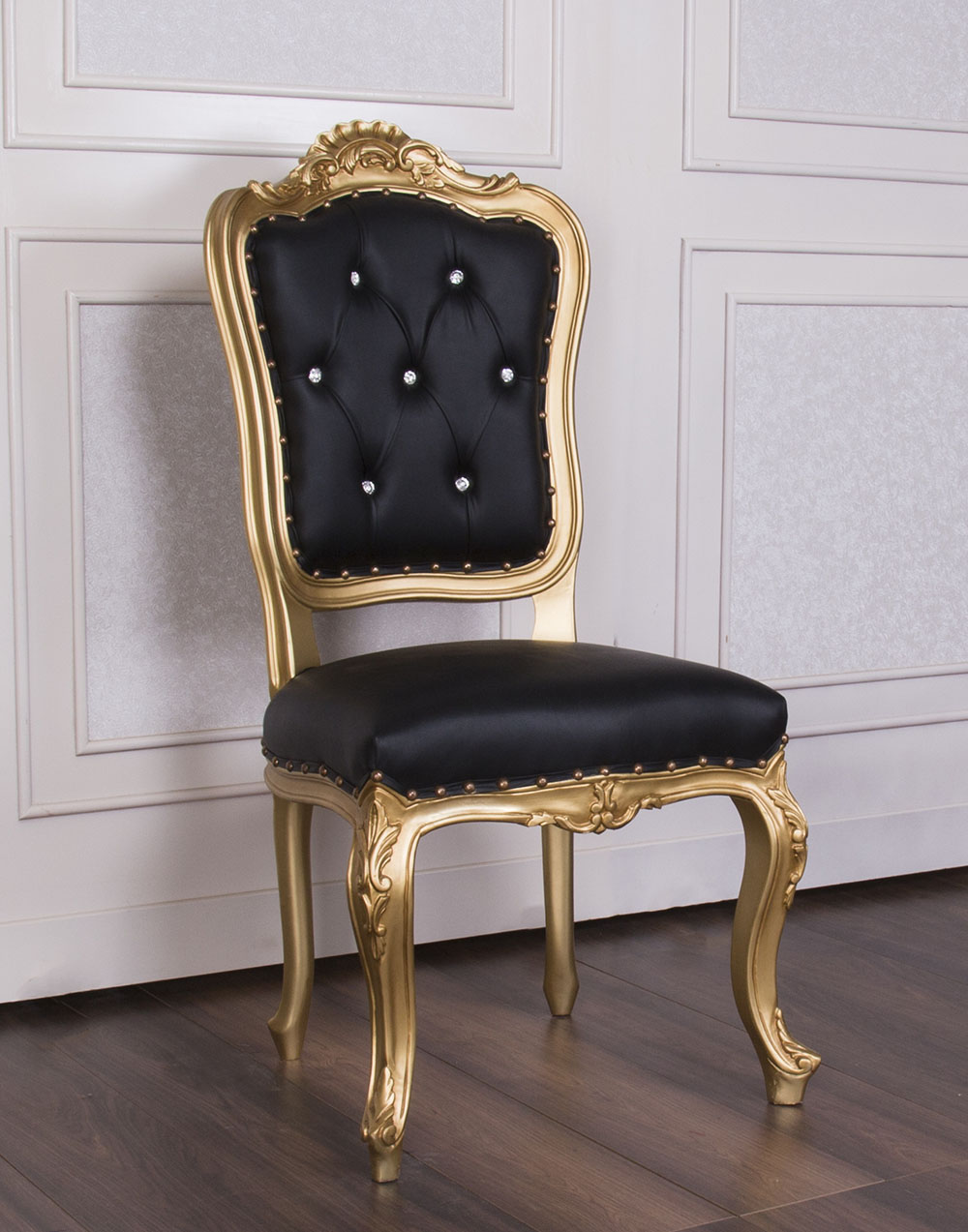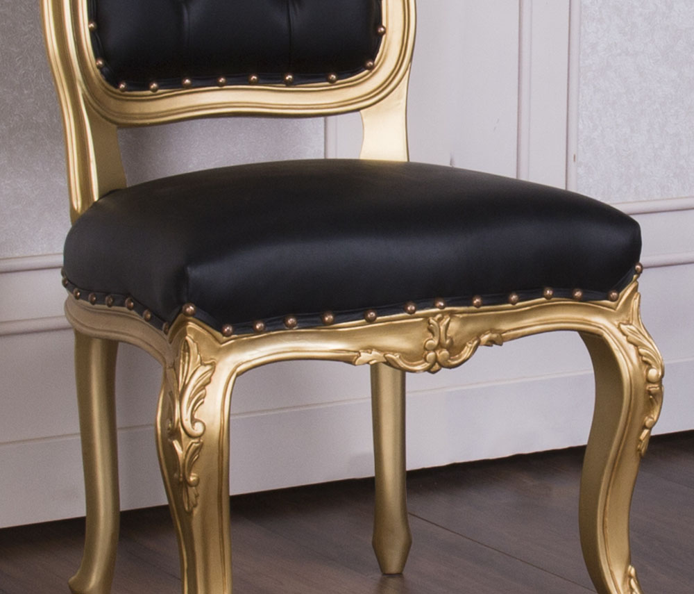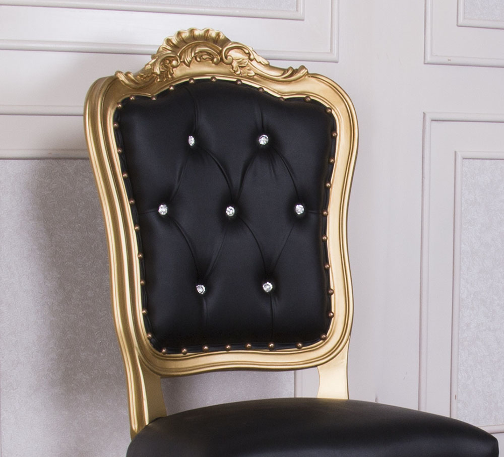 Baroque Style Dining Chair with a Gold wooden Frame and Black Faux Leather combined with SW crystals to enhance the Elegance.