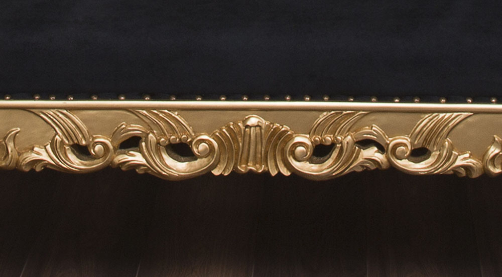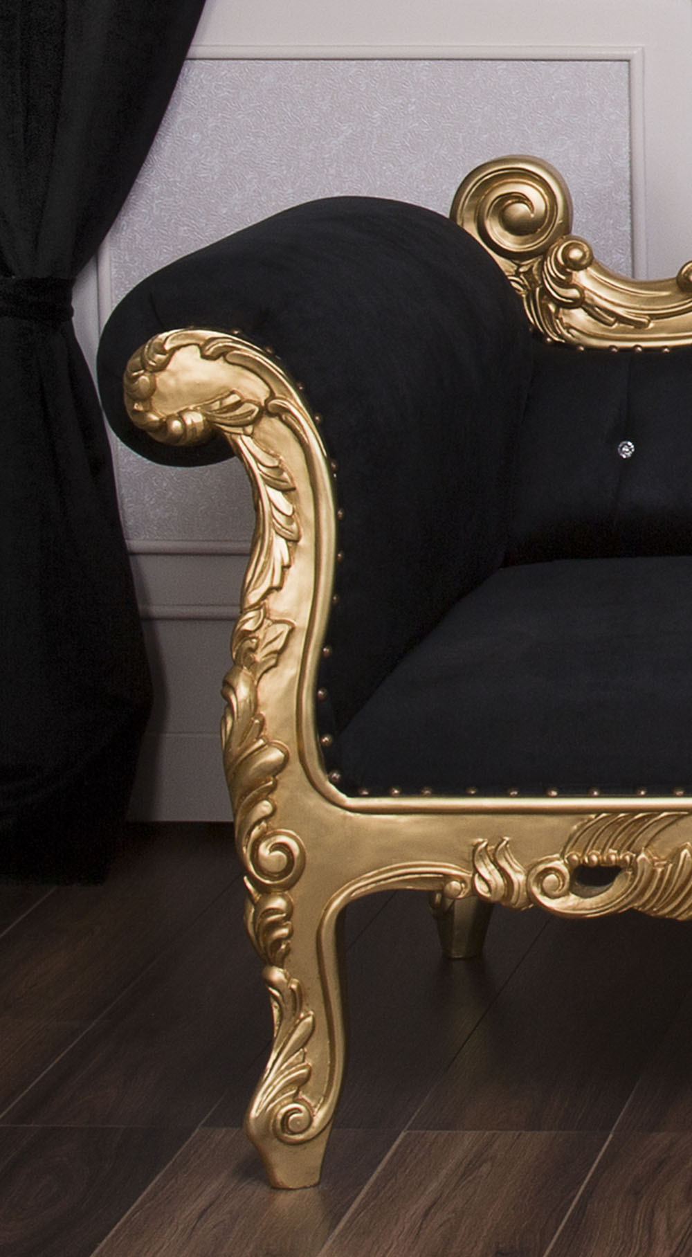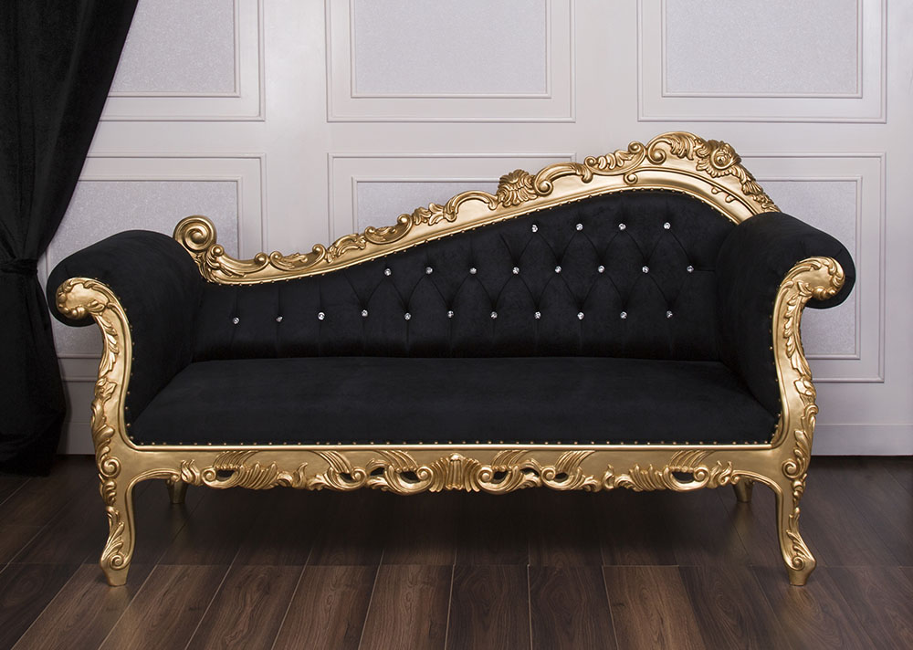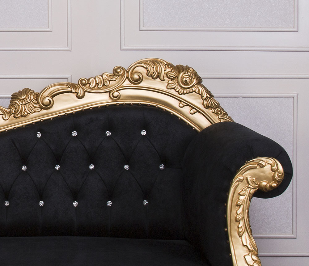Baroque Style Chaise Lounge with a Gold wooden Frame and Black Faux Suede combined with SW crystals to enhance the Elegance.