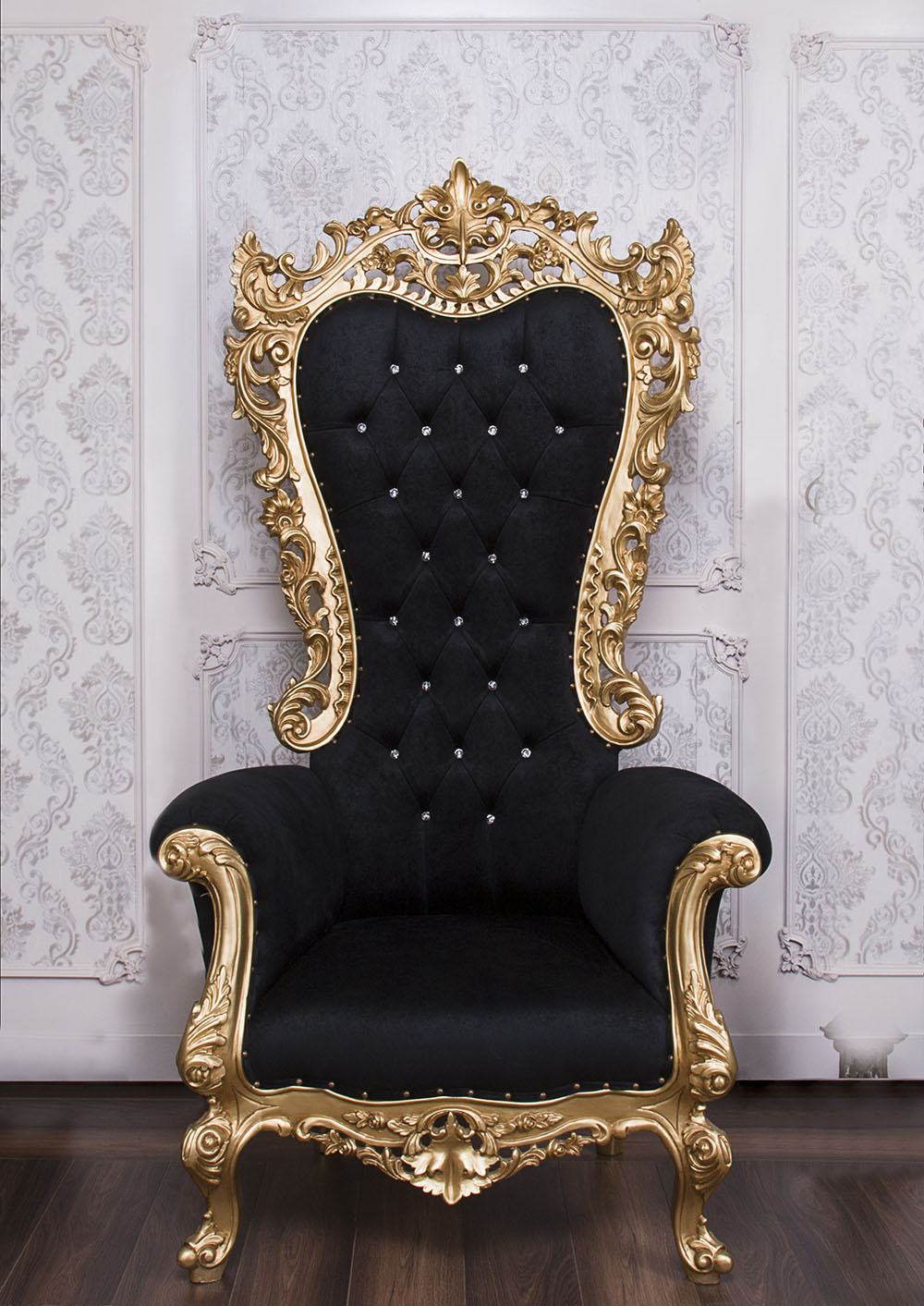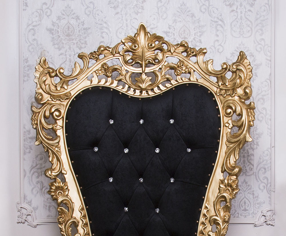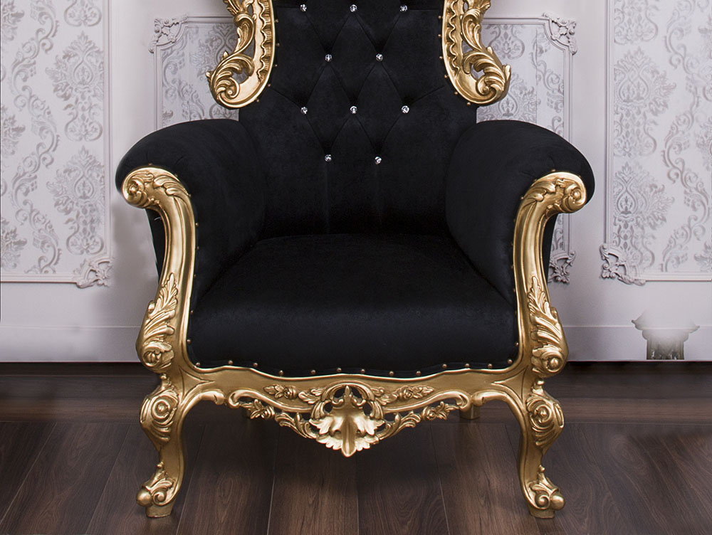 Classic Style Throne Chair with a Gold wooden Frame and Black Faux Suede combined with SW crystals to enhance the Elegance.