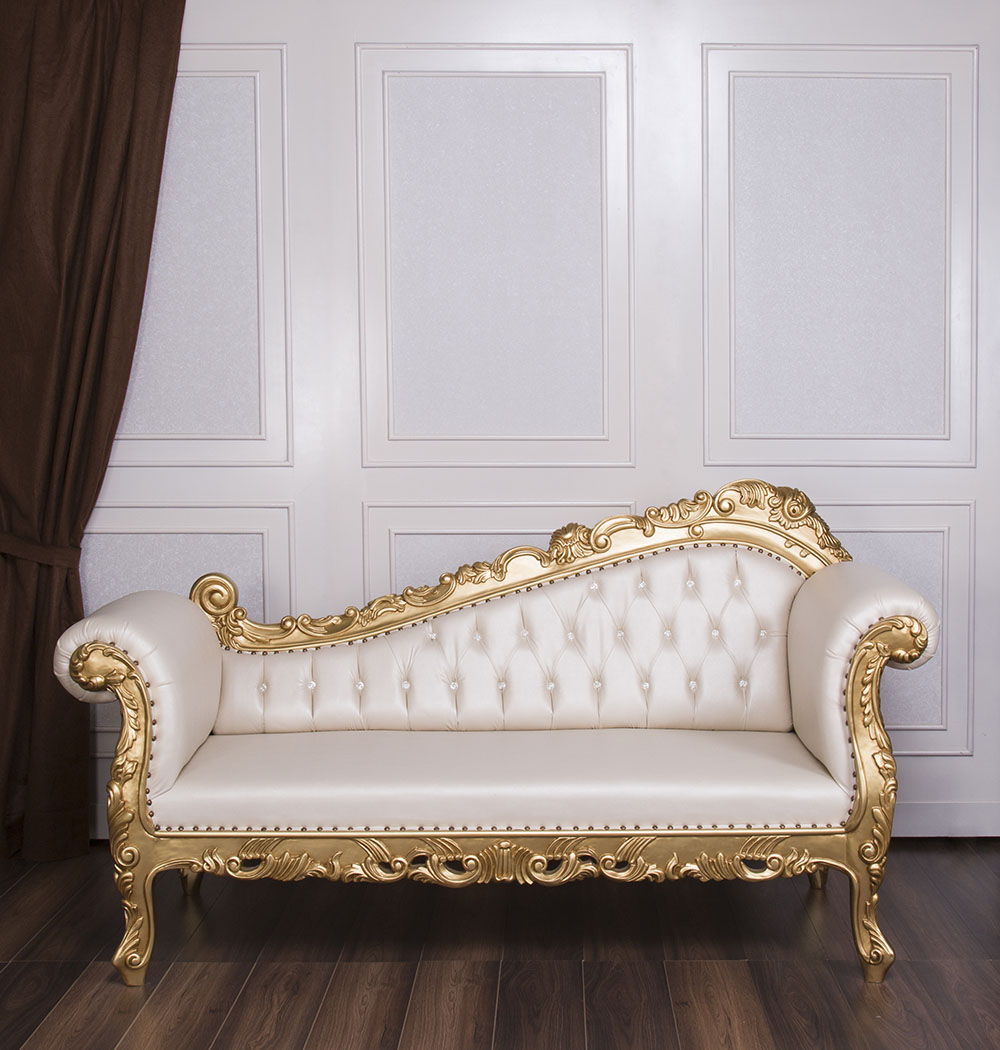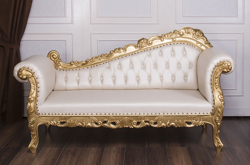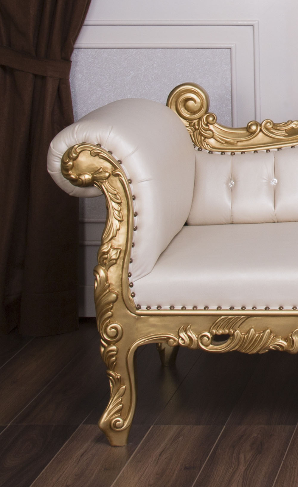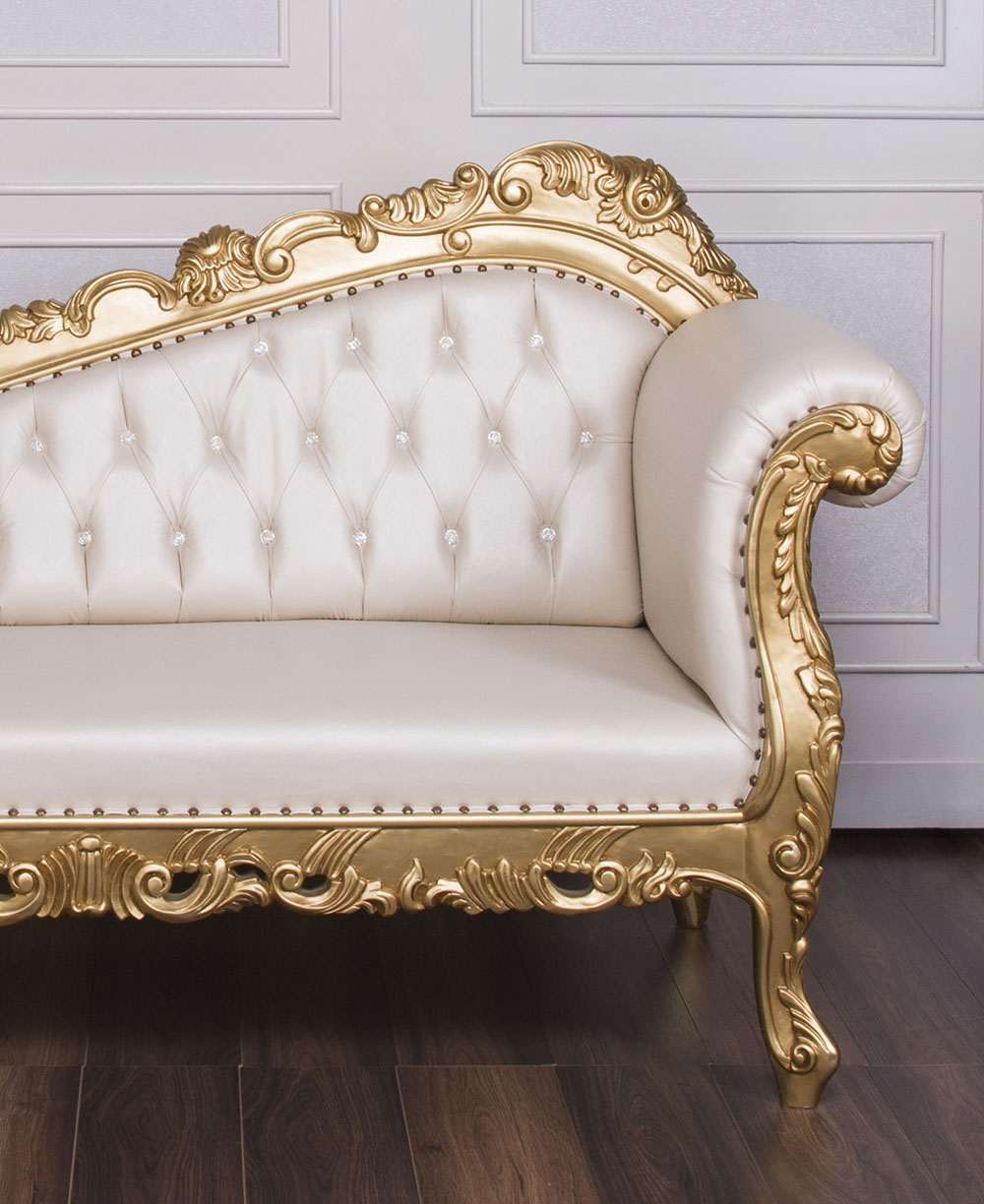 Baroque Style Chaise Lounge with a Gold wooden Frame and Champagne Faux leather combined with SW crystals to enhance the Elegance.