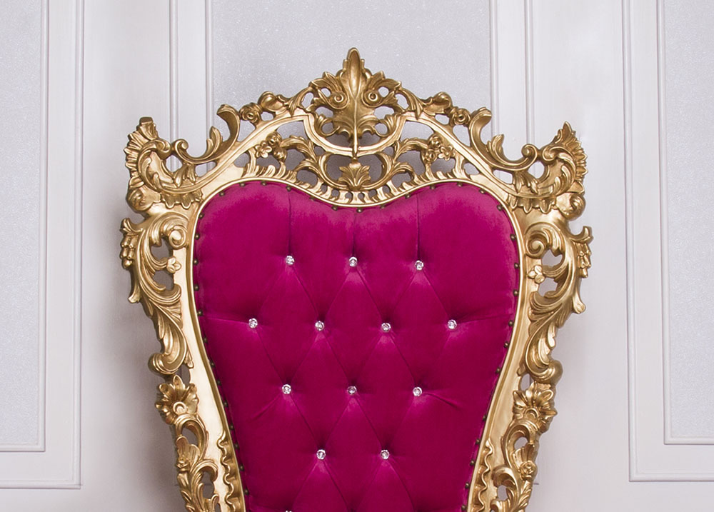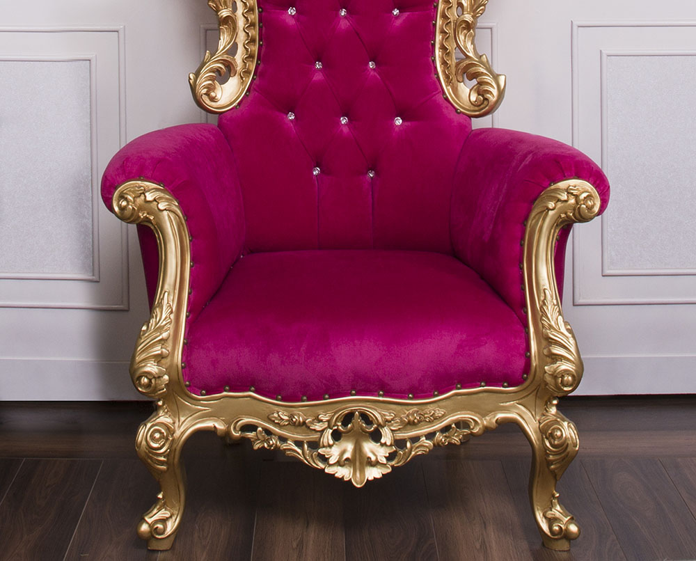 Classic Style Throne Chair with a Gold wooden Frame and Pink Faux Suede combined with SW crystals to enhance the Elegance.