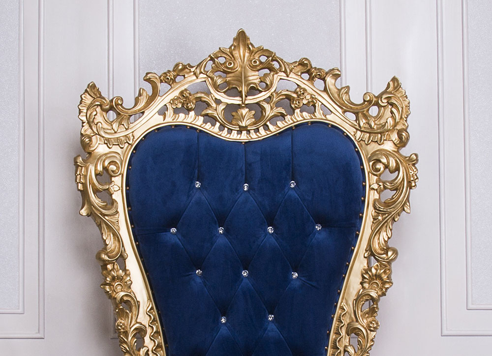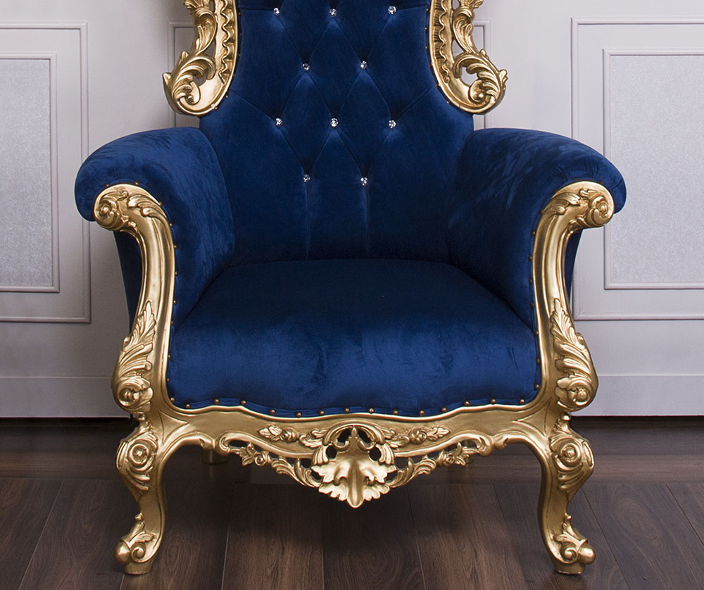 Classic Style Throne Chair with a Gold wooden Frame and Royal Blue Faux Suede combined with SW crystals to enhance the Elegance.