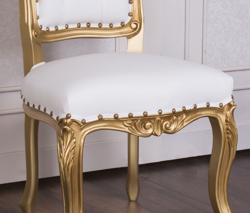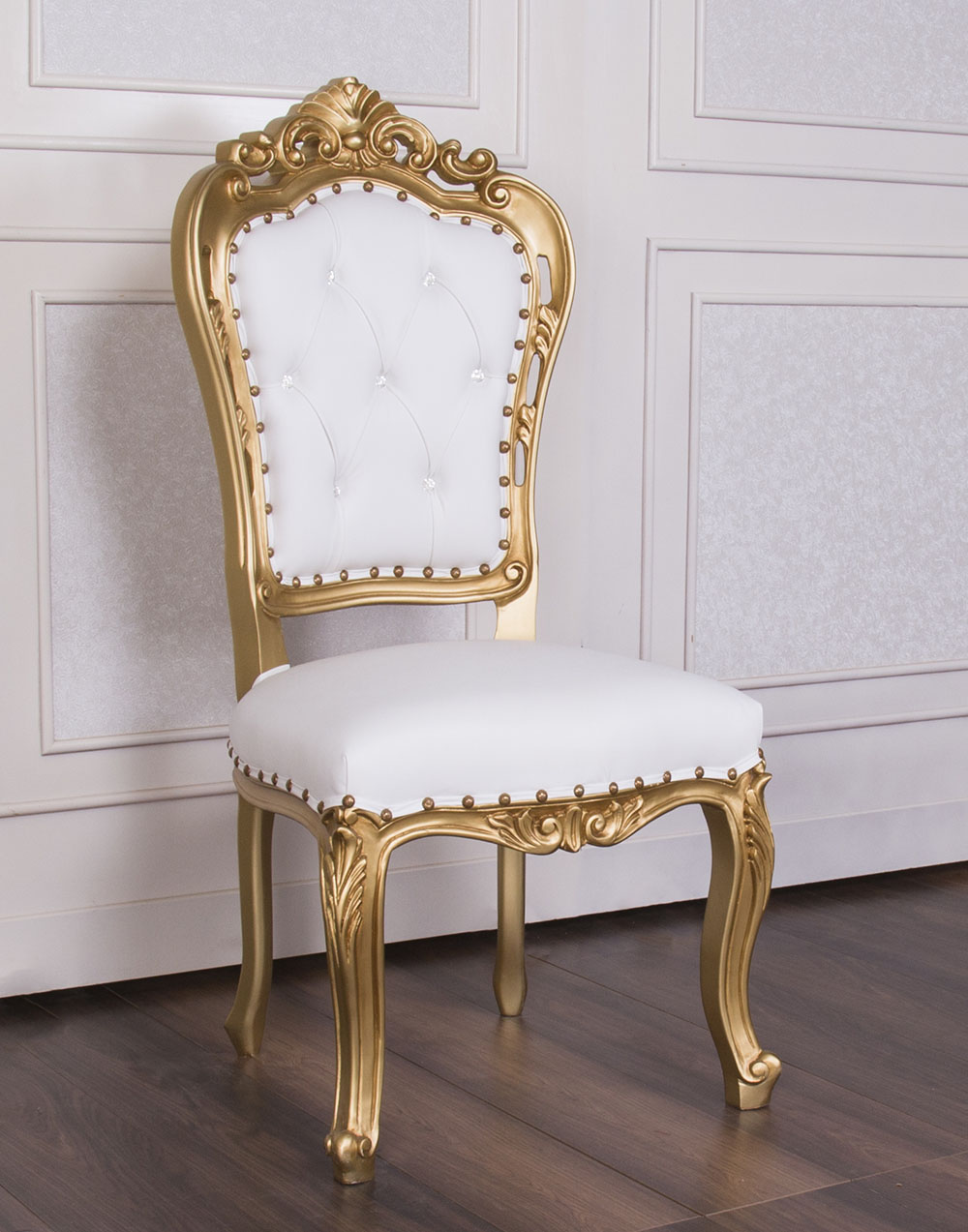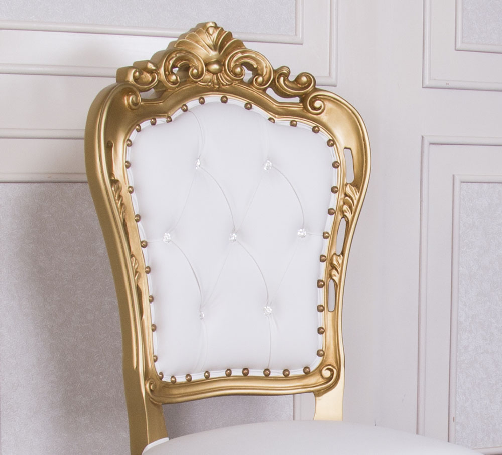 Baroque Style Dining Chair with a Gold wooden Frame and White Faux Leather combined with SW crystals to enhance the Elegance.