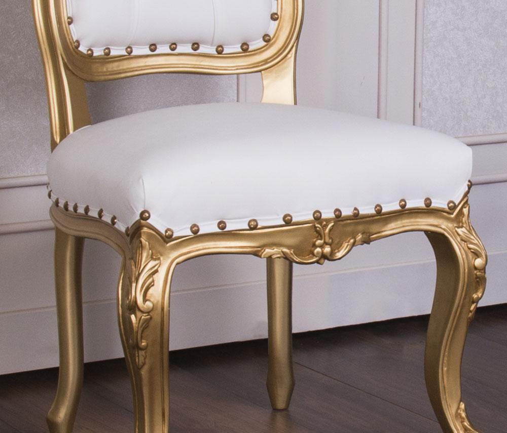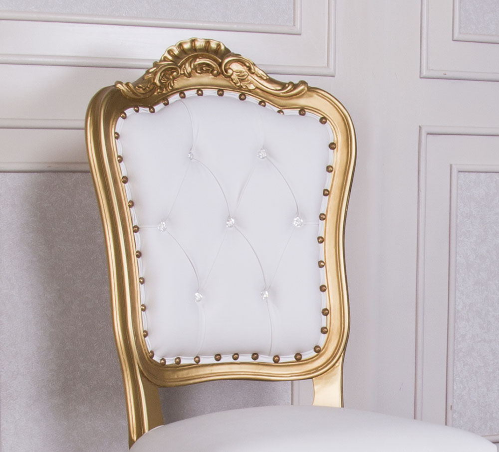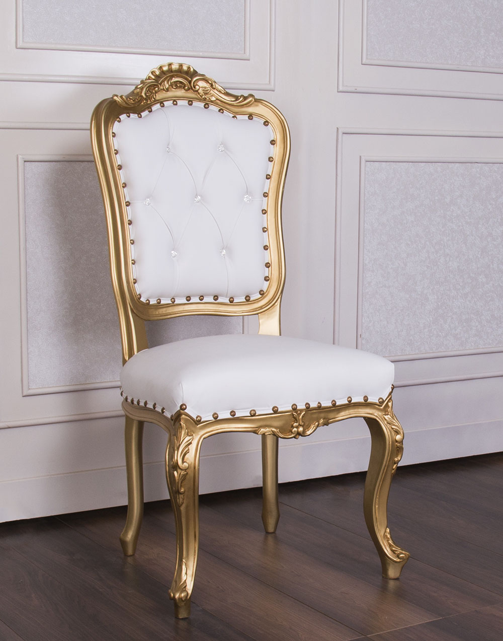 Baroque Style Dining Chair with a Gold wooden Frame and White Faux Leather combined with SW crystals to enhance the Elegance.