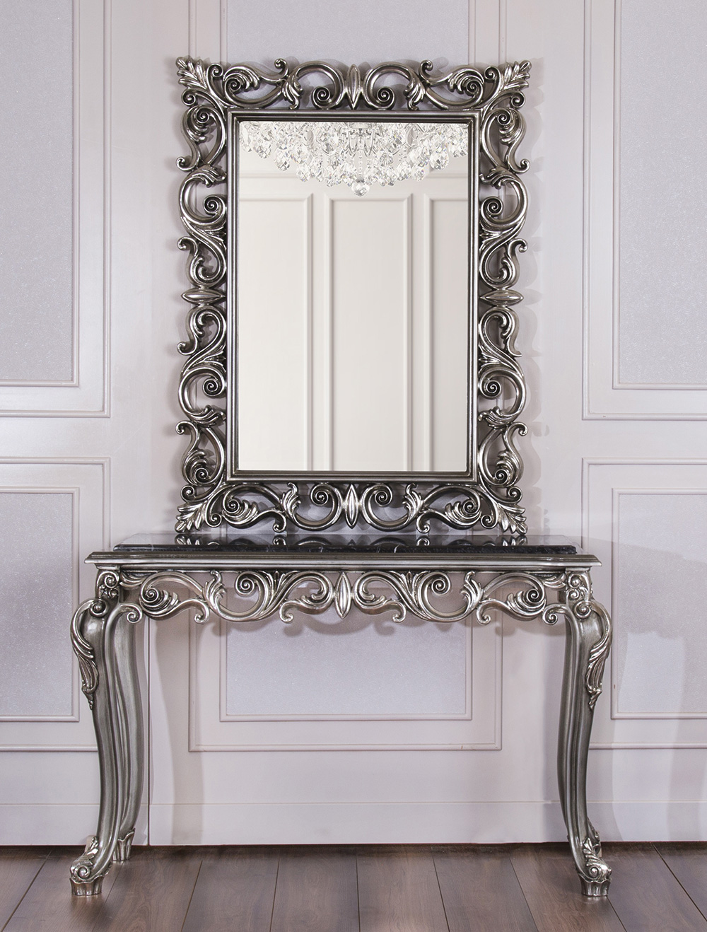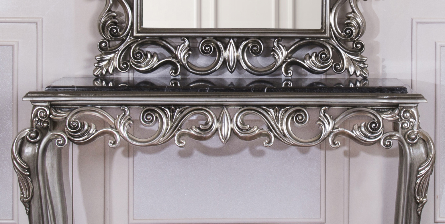 KHNUM full console table with mirror in Lavish Silver with a black marble top finish for added luxury