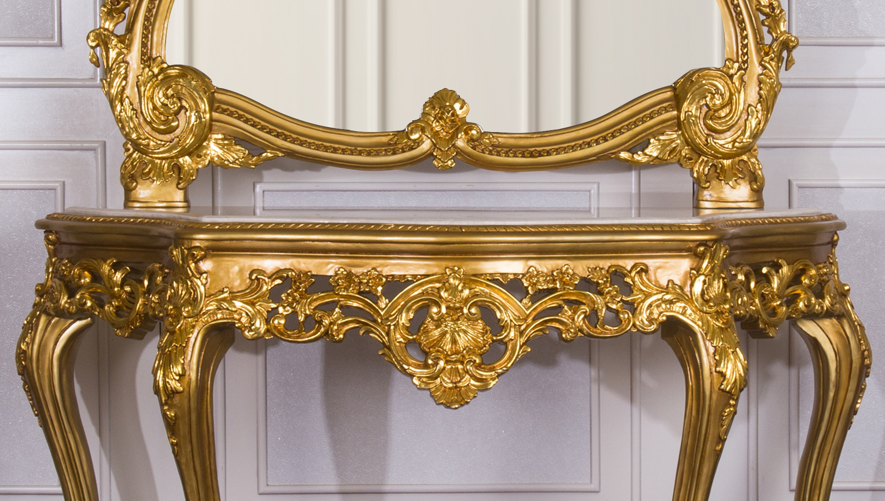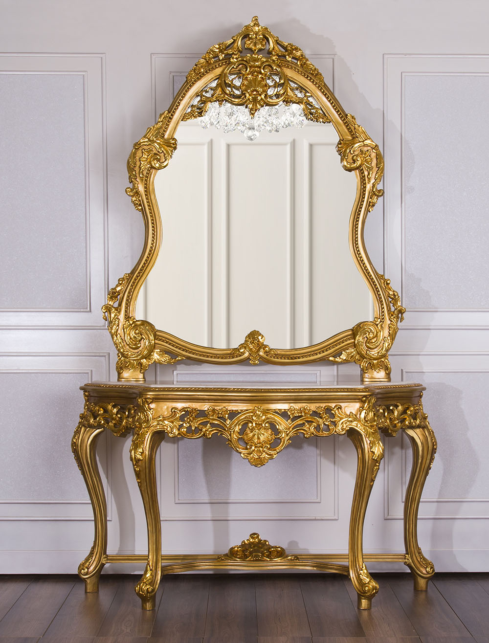 MEKHIT full console table with mirror is a delicately crafted console to complete your luxury interior and is breathtakingly unique. It is a stand out piece of furniture which is sure to impress. Made from Solid wood this console is made for stability for generations to come, in a luxury gold with a cream marble top this is an extravagant design for your home.