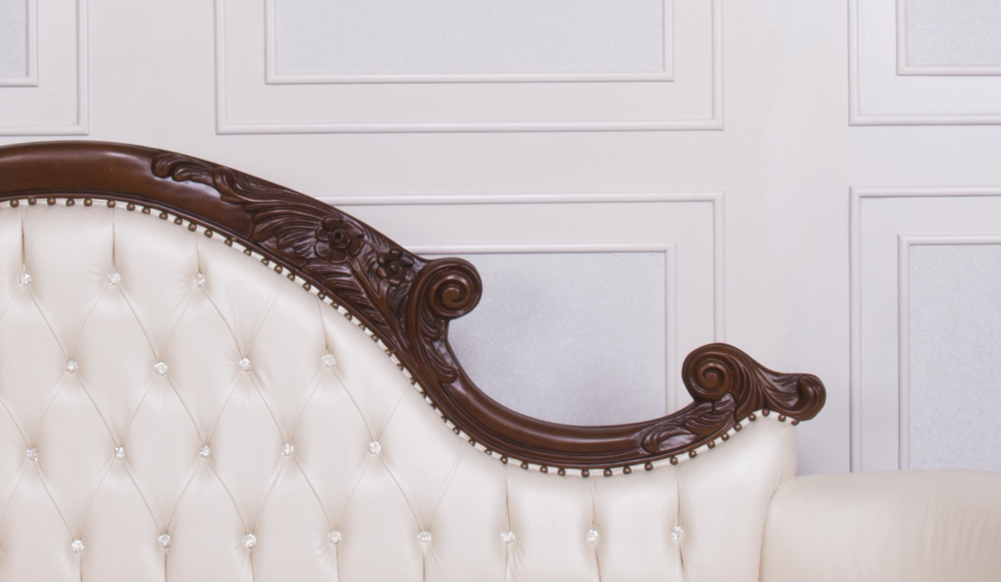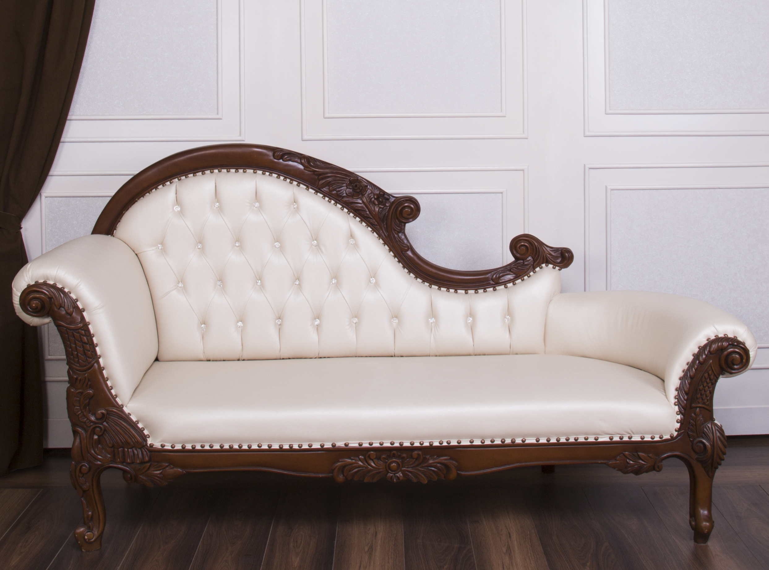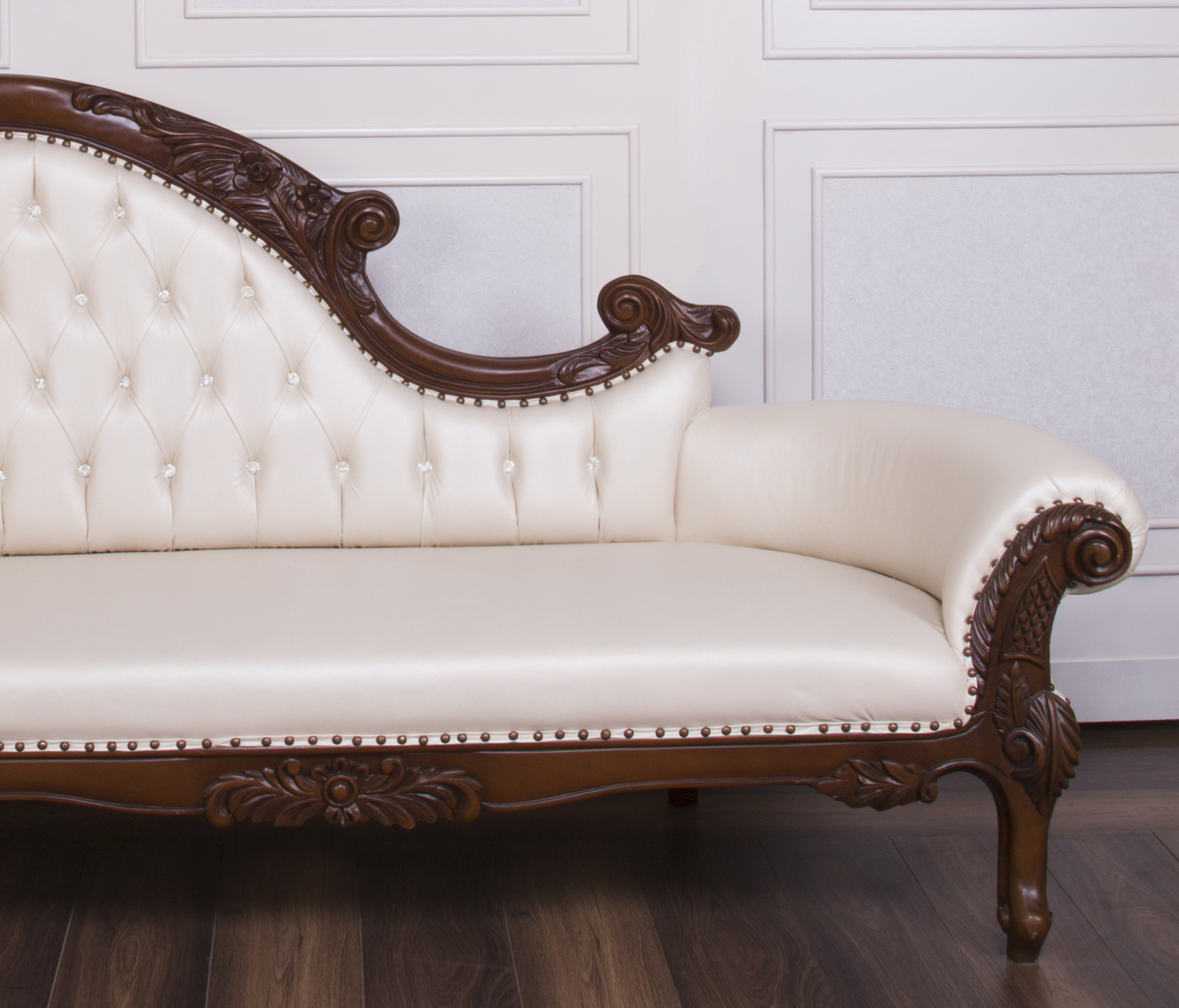 Baroque Style Chaise Lounge with a Dark wooden Frame and Champagne Faux leather combined with SW crystals to enhance the Elegance.