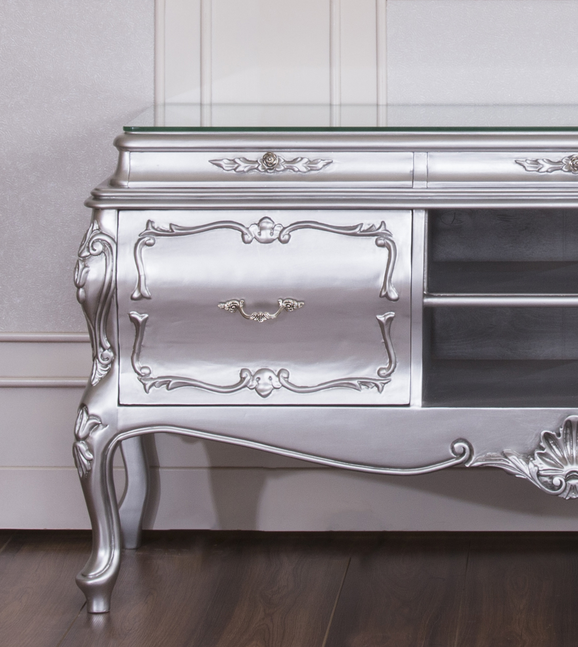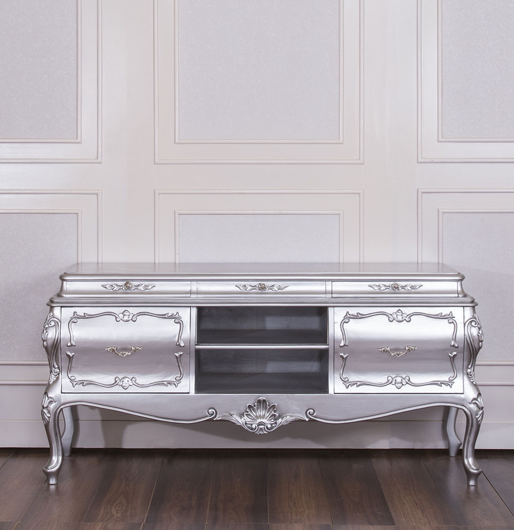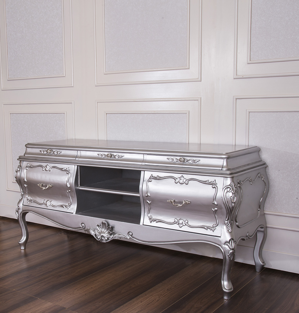 Indulge yourself with our Antique style Tv unit with sideboard ' NEPHYTHYS ' created for simplicity and versatile to enhance your interior, coloured in silver for you to lavish in stylish luxury.