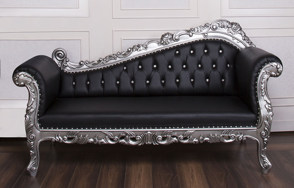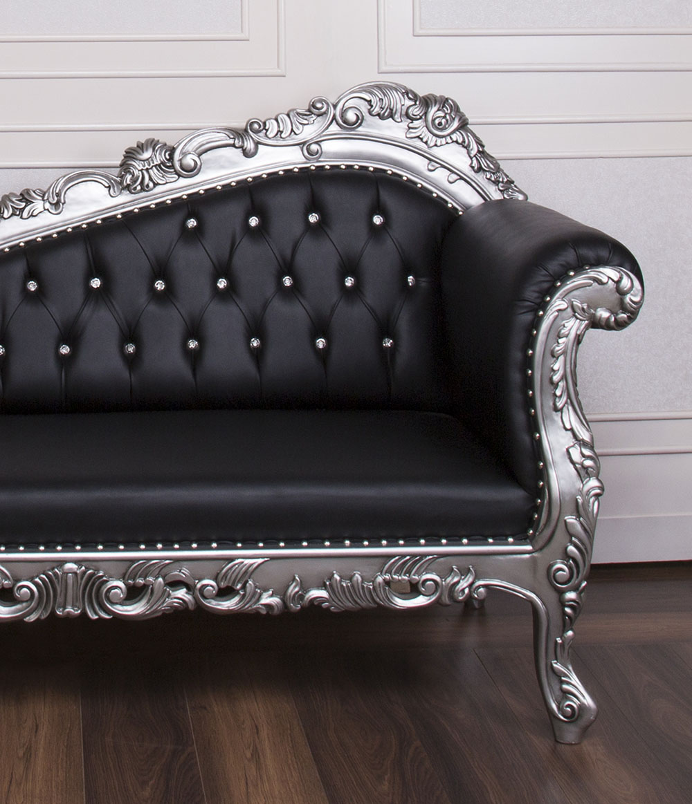 Baroque Style Chaise Lounge with a Silver wooden Frame and Black Faux Leather combined with SW crystals to enhance the Elegance.