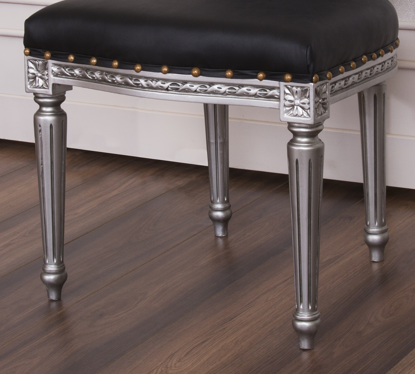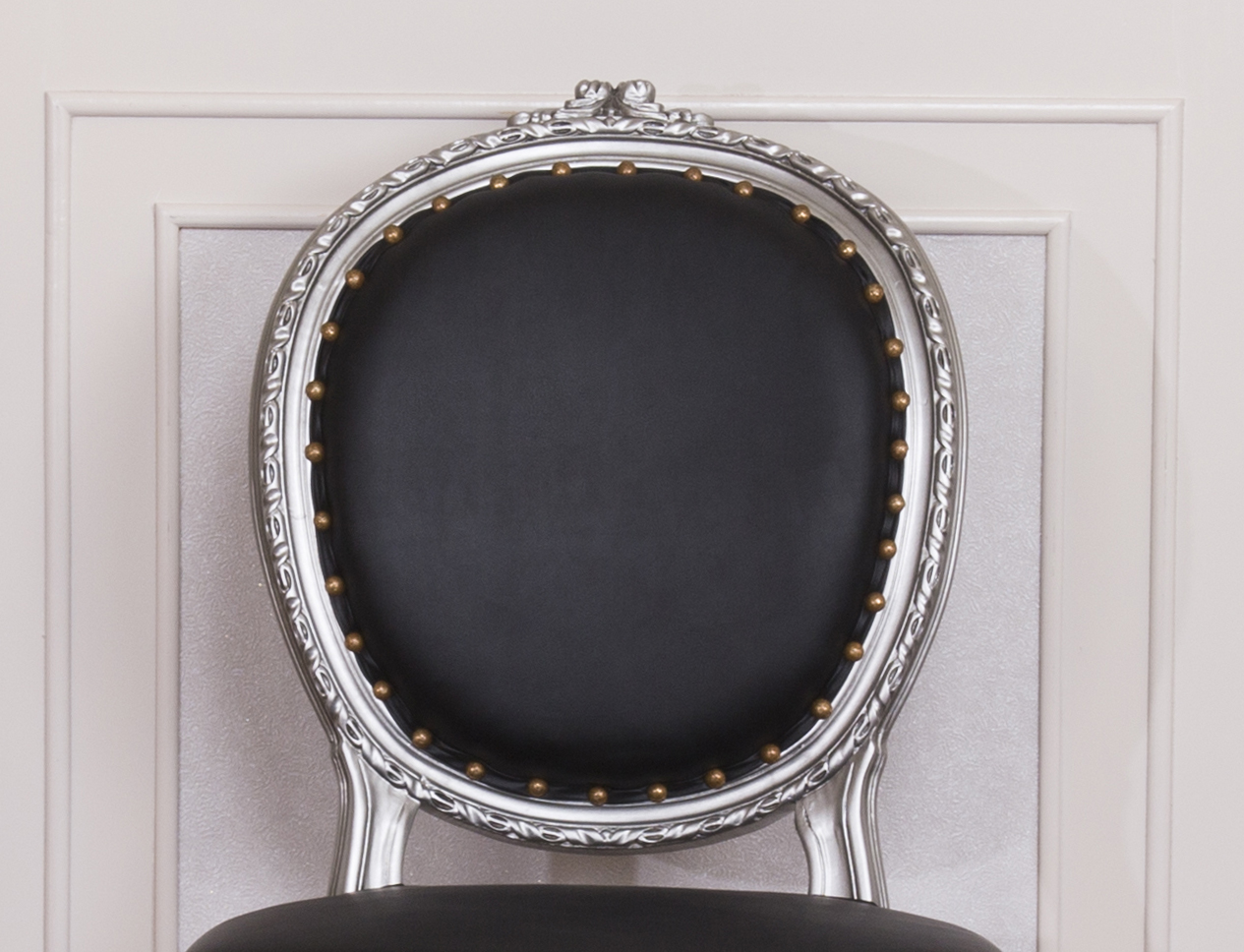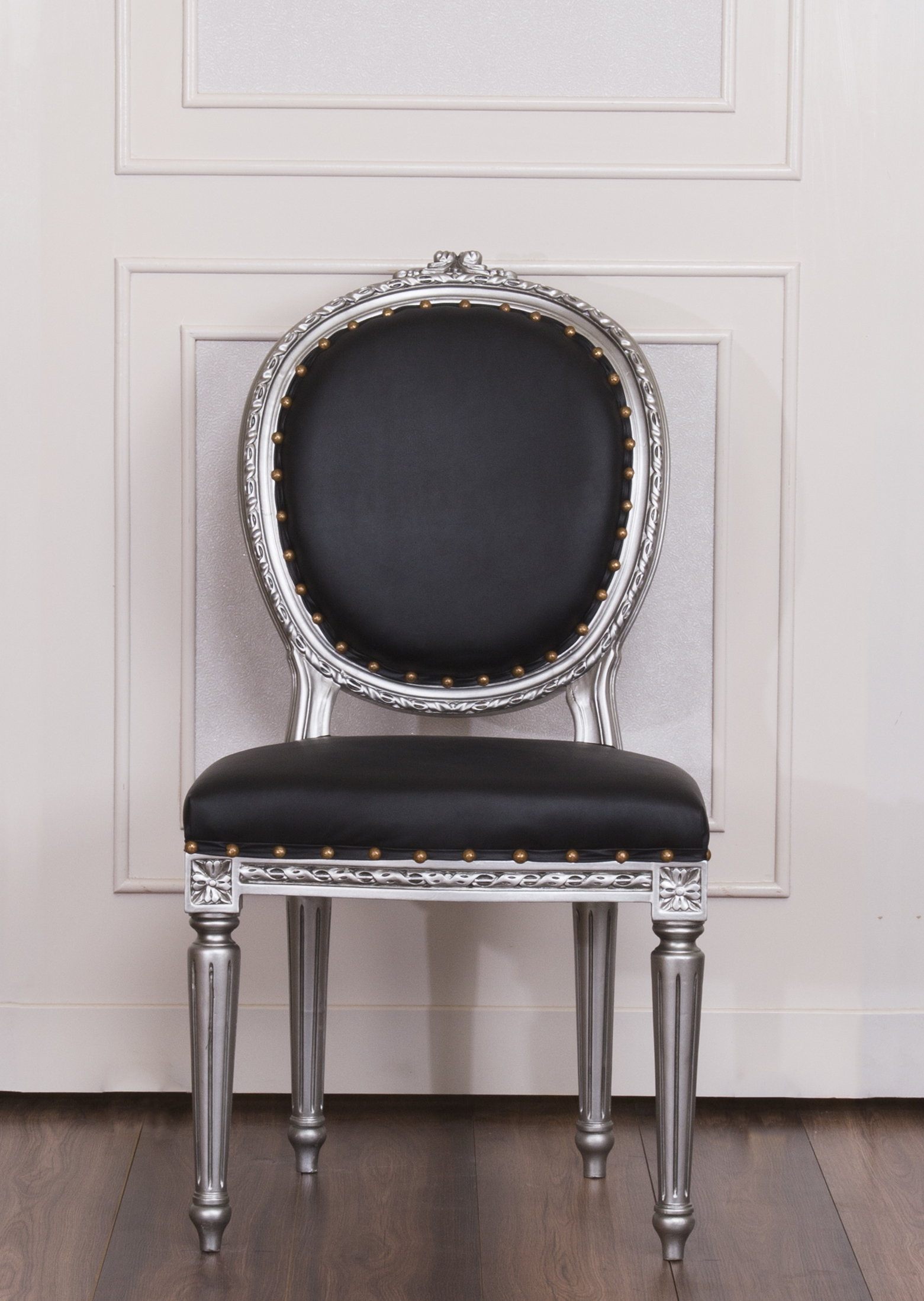 Antique Style Dining Chair with a Silver wooden Frame and Black Faux Leather to bring the flavour of East to your luxury living.