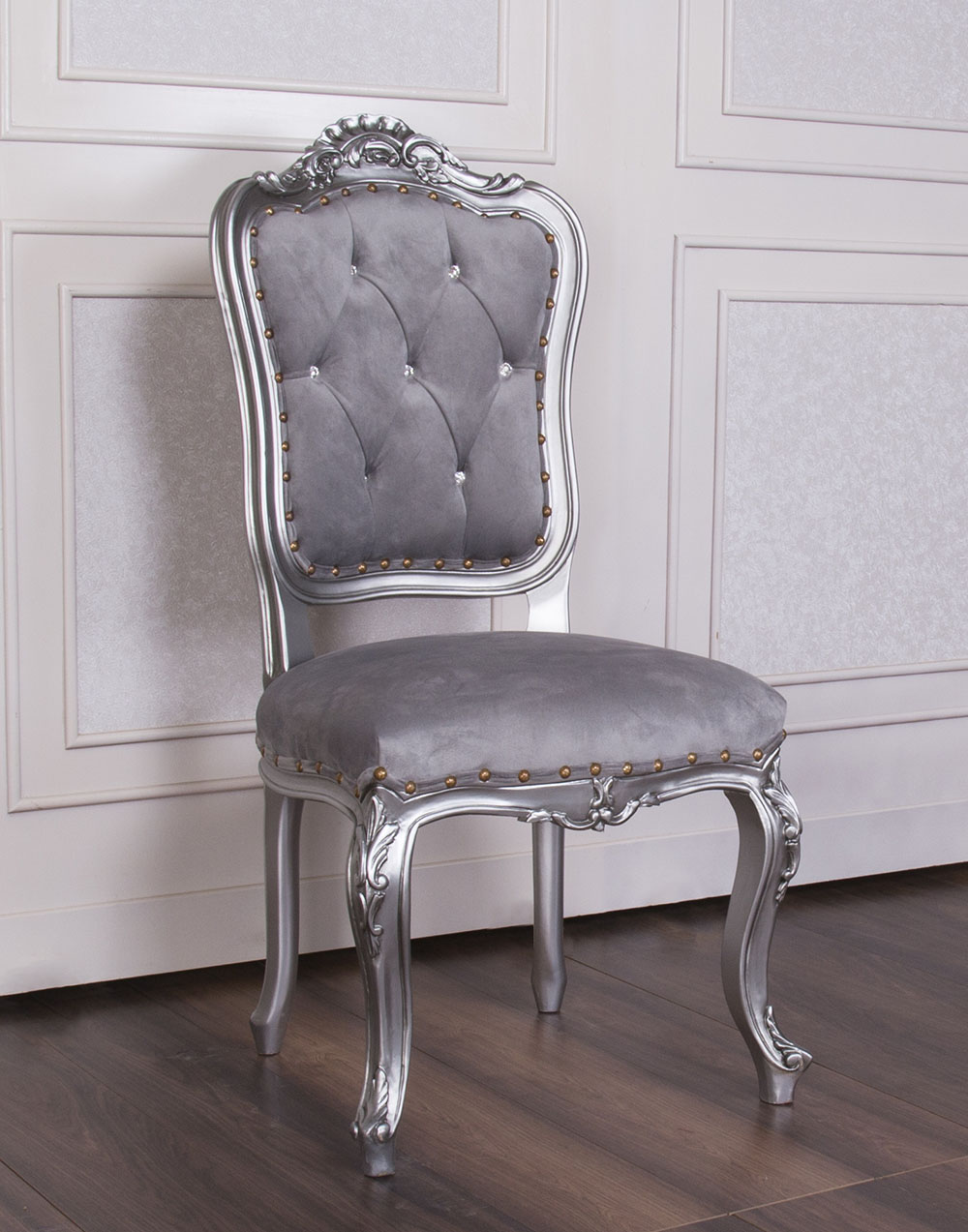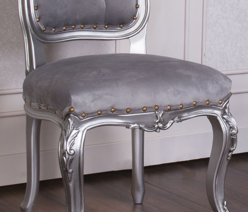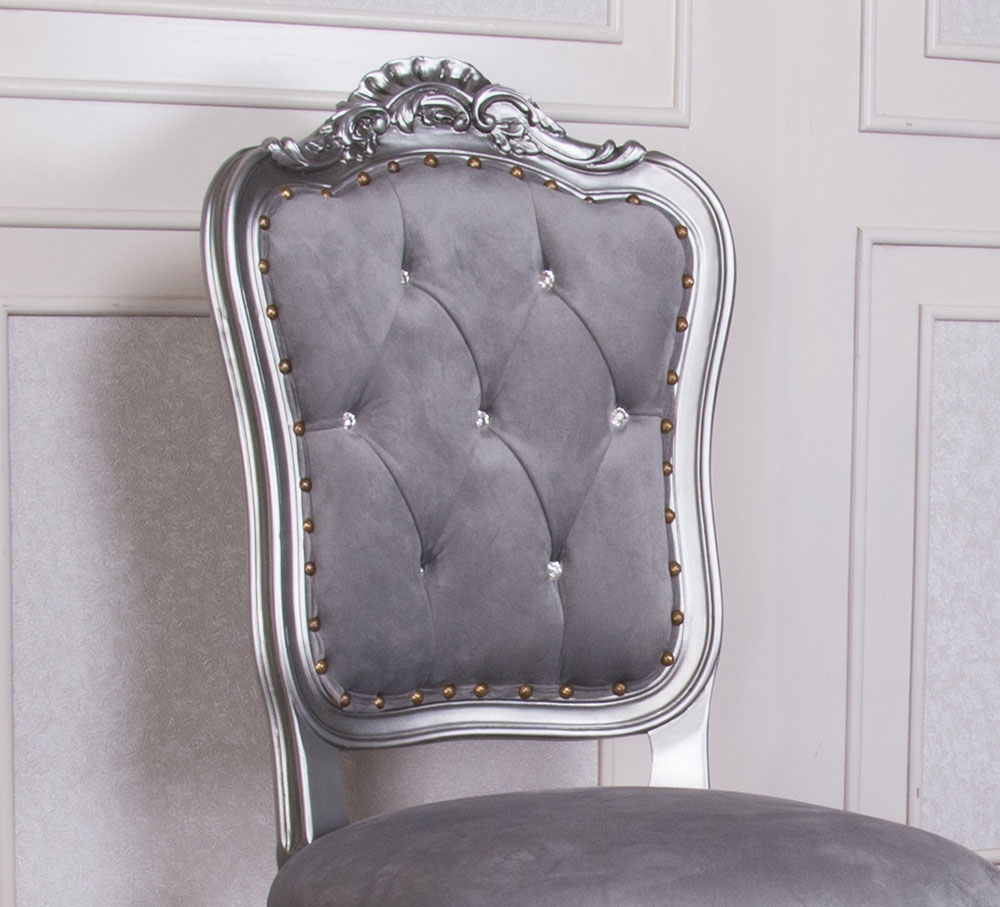 Baroque Style Dining Chair with a Silver wooden Frame and Silver Faux Suede combined with SW crystals to enhance the Elegance.