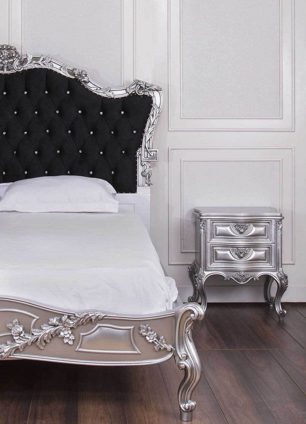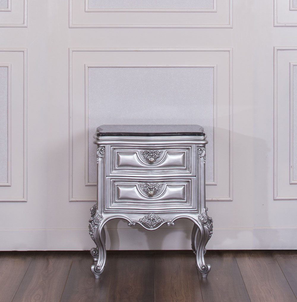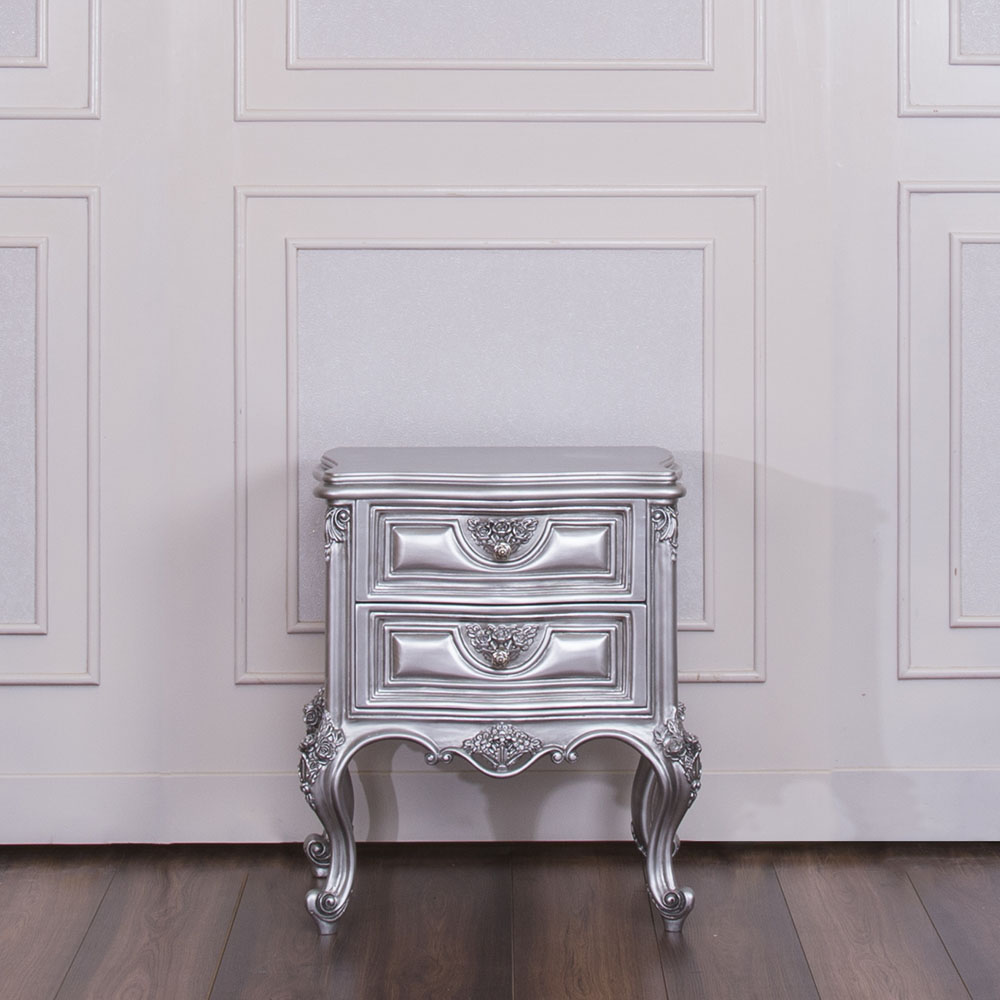 THOTH Bedside Drawers are all silver with hand crafted details to enhance richness. These beautiful drawers are elegant and complete your lavish boudoir with extreme beauty. ( Sold Individually )