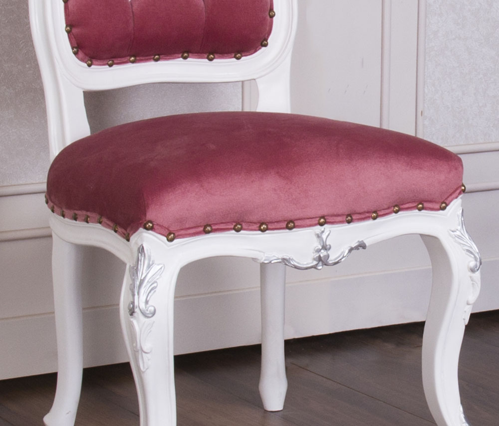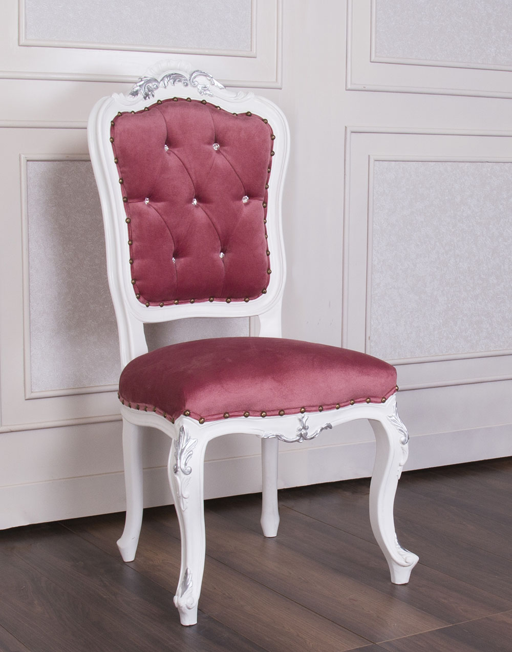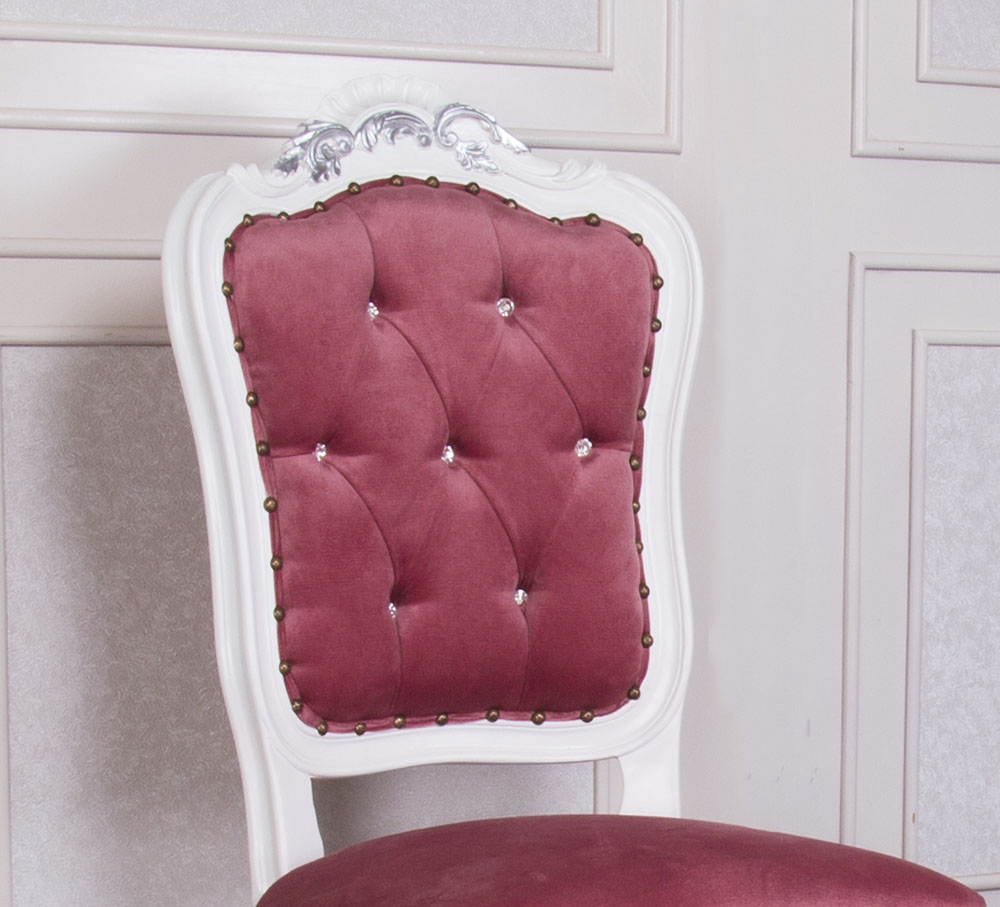 Baroque Style Dining Chair with a White wooden Frame and Pink Faux Suede combined with SW crystals to enhance the Elegance.